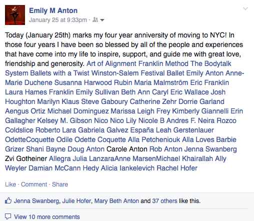 My calling to moved to New York City originated with dance. And it is dance that I find every day. In all the pain. In all the heartbreak. In all the joy. In all the happiness. In the rain. And in the sun. I continue to come back to dance, each and every single day. I have come to believe that it is dance which carries me through it all. Dance which nourishes my soul. Dance is my purpose on this Earth. I am blessed to have figured this truth out at a young age, taken the great leaps of faith which have led me to having a professional career in dance and have a body which supports me in my goal. Although I feel like there are no accidents and I sense that my supportive body and presence and confidence to leap are all a part of the fact that dance is my purpose on this Earth. I believe there is a God, a Creator, a Universal Love, Grace, and Consciousness which is loving, kind and full of mercy and support. I believe that there is a master plan and we need to be willing to listen, hear and take the steps on our unique path. We must be actively engaged in our lives. We must be willing to do what scares us the most and leap off a cliff every now and again, completely confident that we will be caught and held in the loving and tender hands of our God. I have to believe because I see and have felt so much good, so much love, so much grace, but also because I have felt pain, heartbreak and uncertainty.
